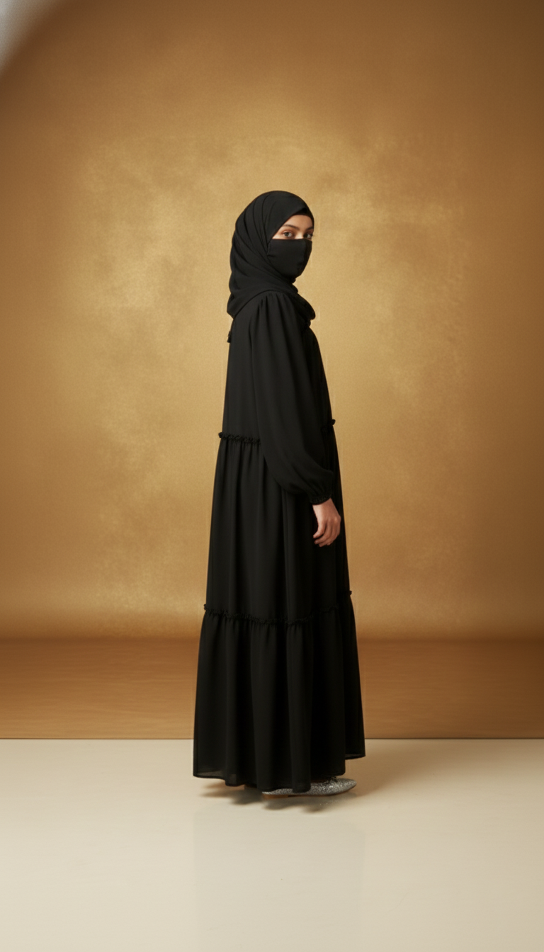 Black Tiered Frill Kids Abaya | Imported Nida & Chiffon | Modest Party Wear