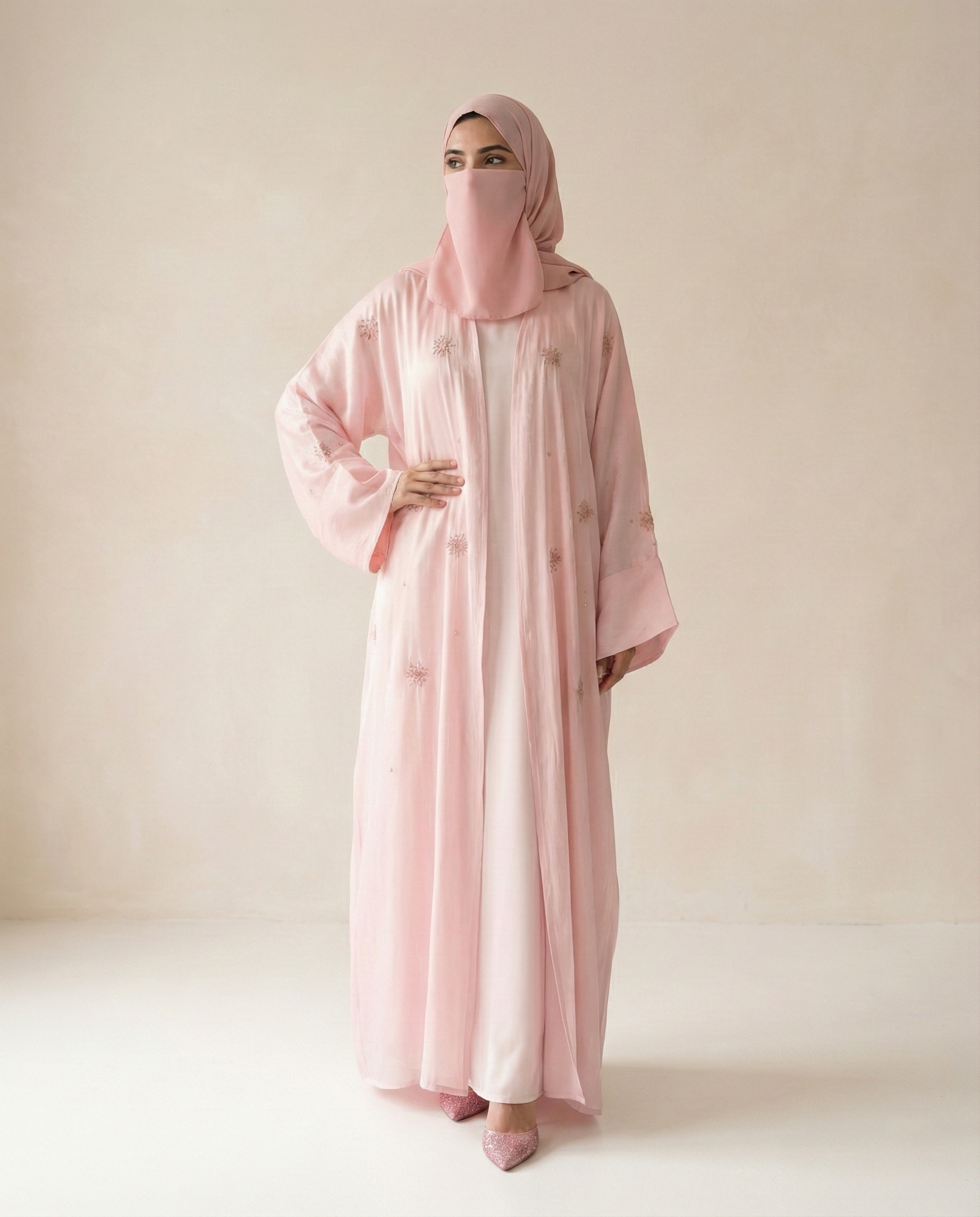 Blush Pink Soft Feminine Jacket Abaya with Shimmer Organza