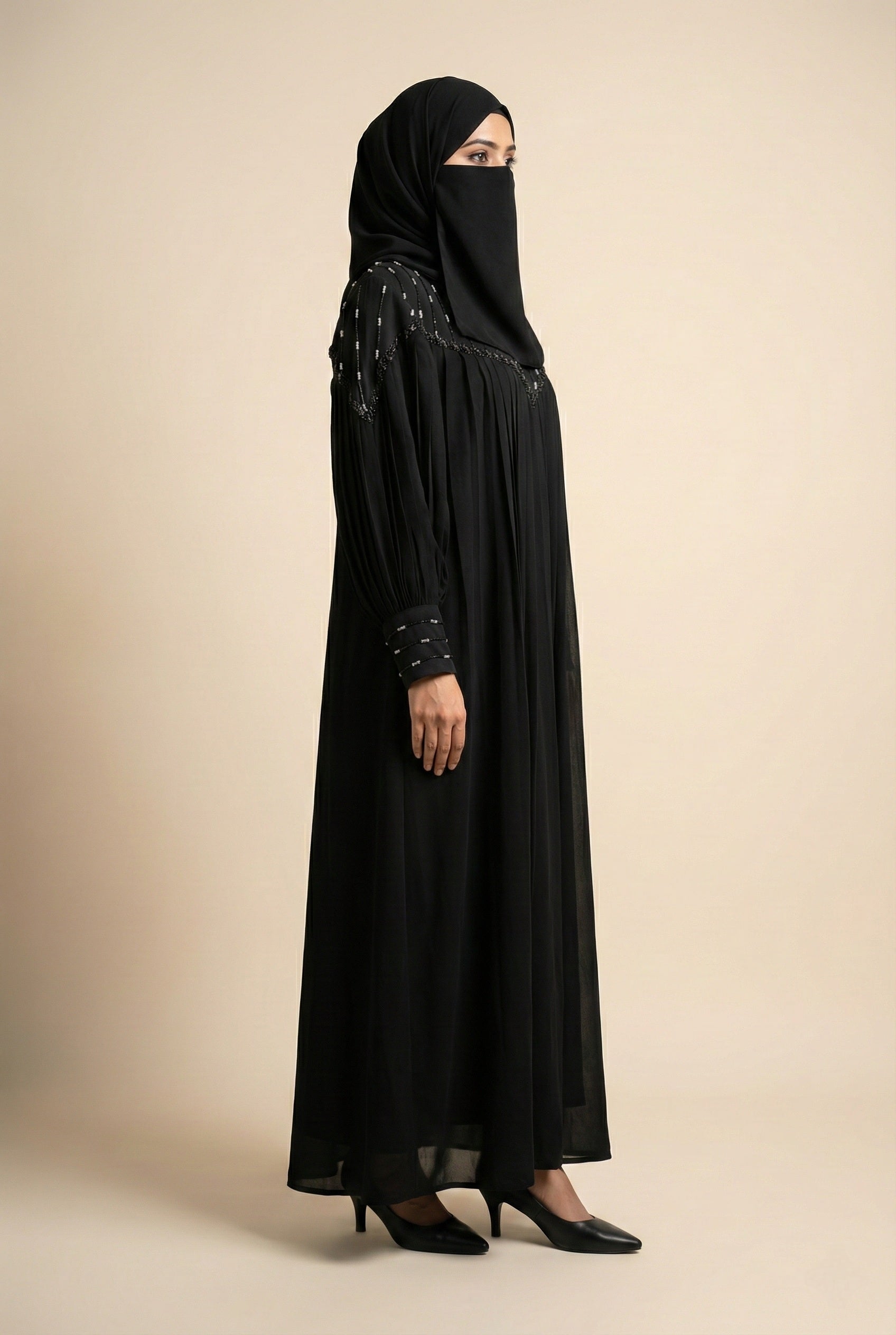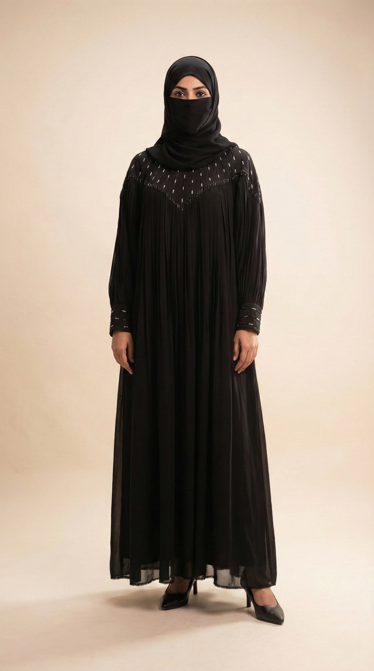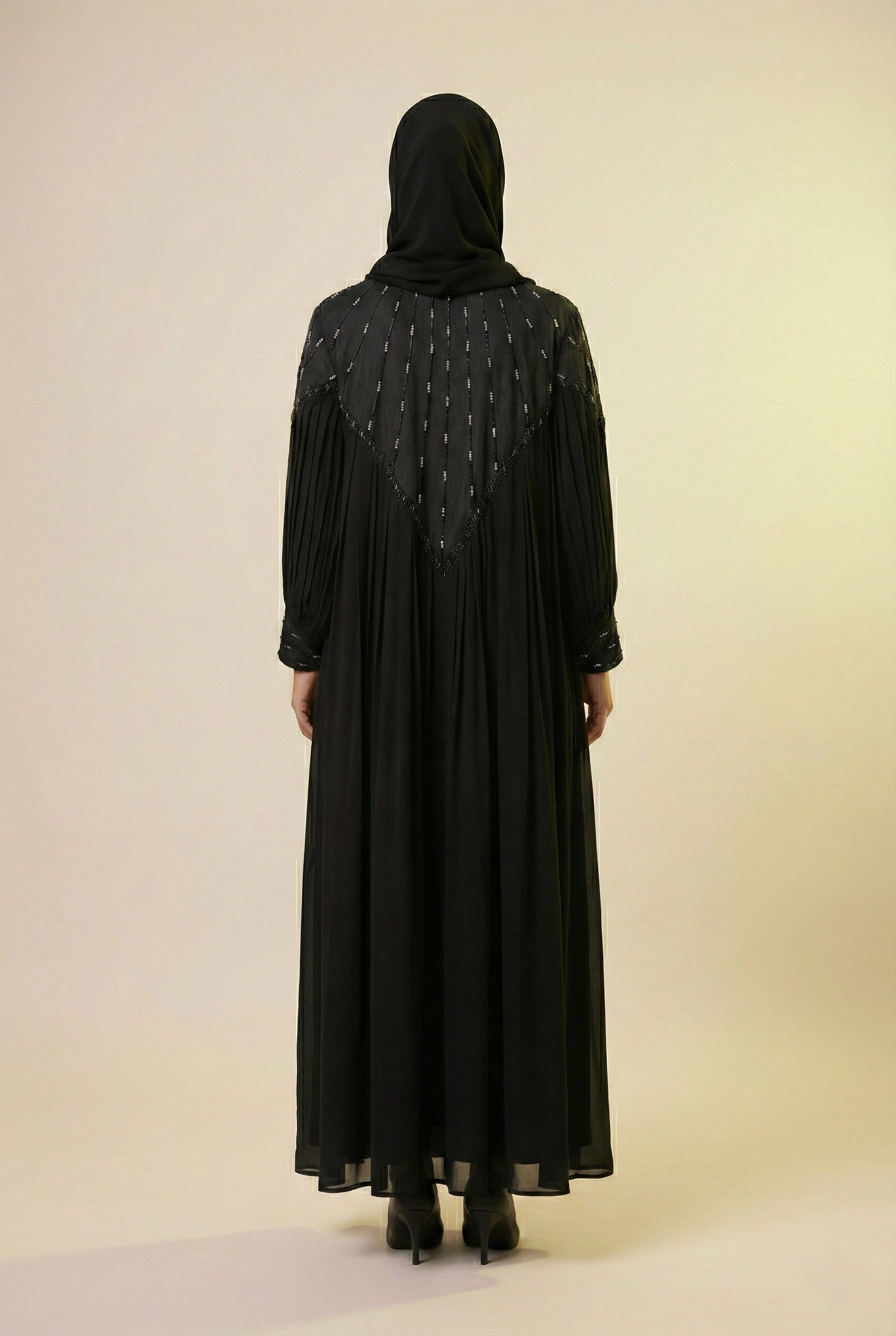 Black Chiffon & Net Abaya with Front & Back Handwork | Designer Statement
