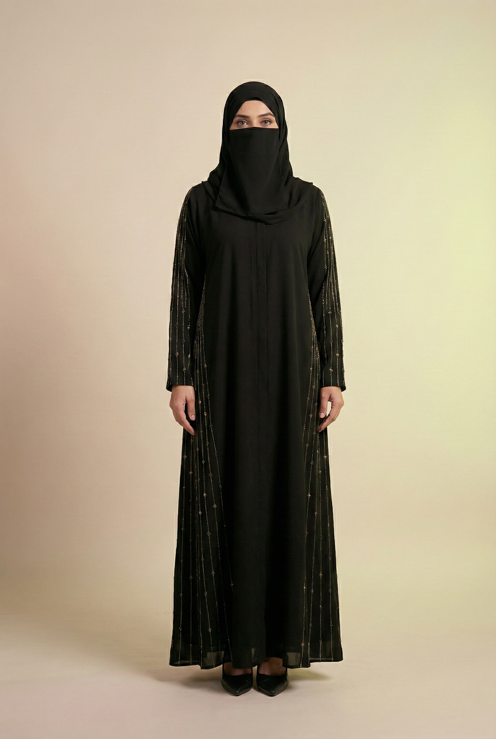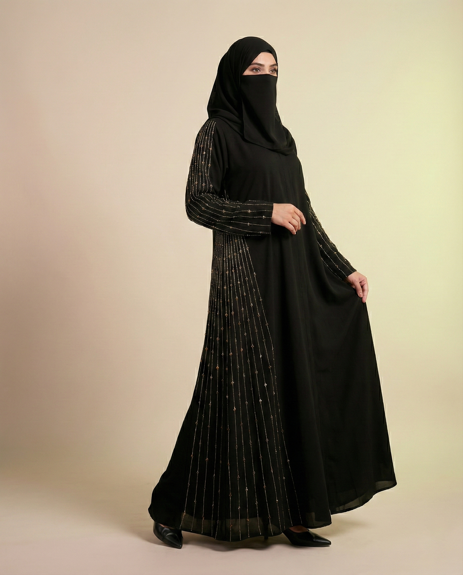The abaya is designed in a graceful A-line silhouette, gently flaring from the shoulders for an elegant and elongated appearance. The structured yet flowing cut ensures comfort and ease of movement, making it ideal for formal events, evening gatherings, and celebrations.
