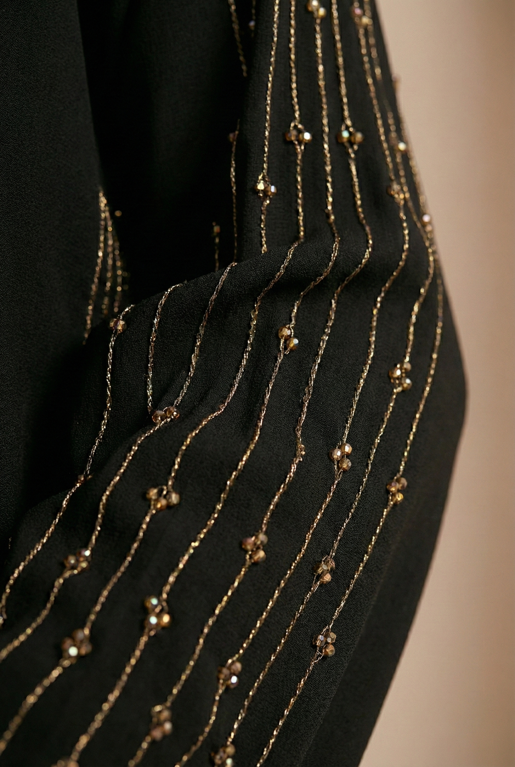Crafted from premium Korean Nida fabric, the abaya offers a soft, fluid drape with a rich matte finish, ensuring comfort, breathability, and full opacity. The design is elevated with delicate golden zari threadwork, accented by gold damru embellishments, adding subtle shimmer and depth without overwhelming the clean silhouette.